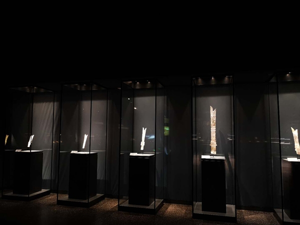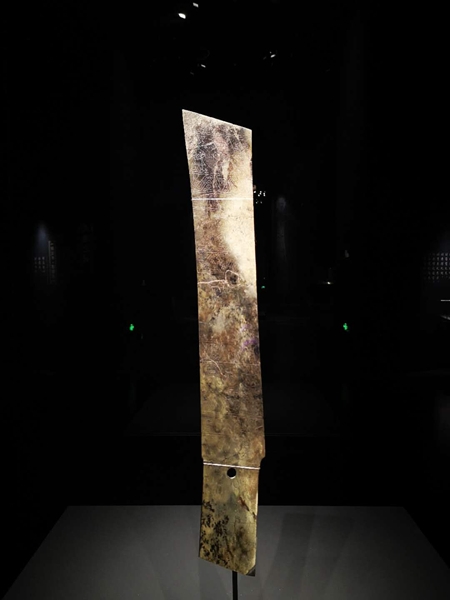 記者看到,提升改造后的綜合館展廳,最大的亮點便是聚齊了三星堆博物館6大國寶中的5件。莊嚴肅穆的青銅大立人,旁邊是象征權利的金杖,與高大的青銅神樹相映相輝。而此次一直鮮少與公眾見面的商代祭山玉璋,也首次回歸三星堆博物館常設展覽展出。這件玉璋上有上下兩組圖案,每組圖案都有人、山和牙璋,描繪的是古蜀先民在圣壇上舉著牙璋祭祀天地山川的場面,圖案中的信息非常豐富,展現了古蜀人宗教的信仰和祭祀方法,在研究古蜀人的宗教、祭祀、禮儀方面有重大的學術價值。此外,目前國內體量最大、長達92厘米的一件玉牙璋,也伴陳左右。