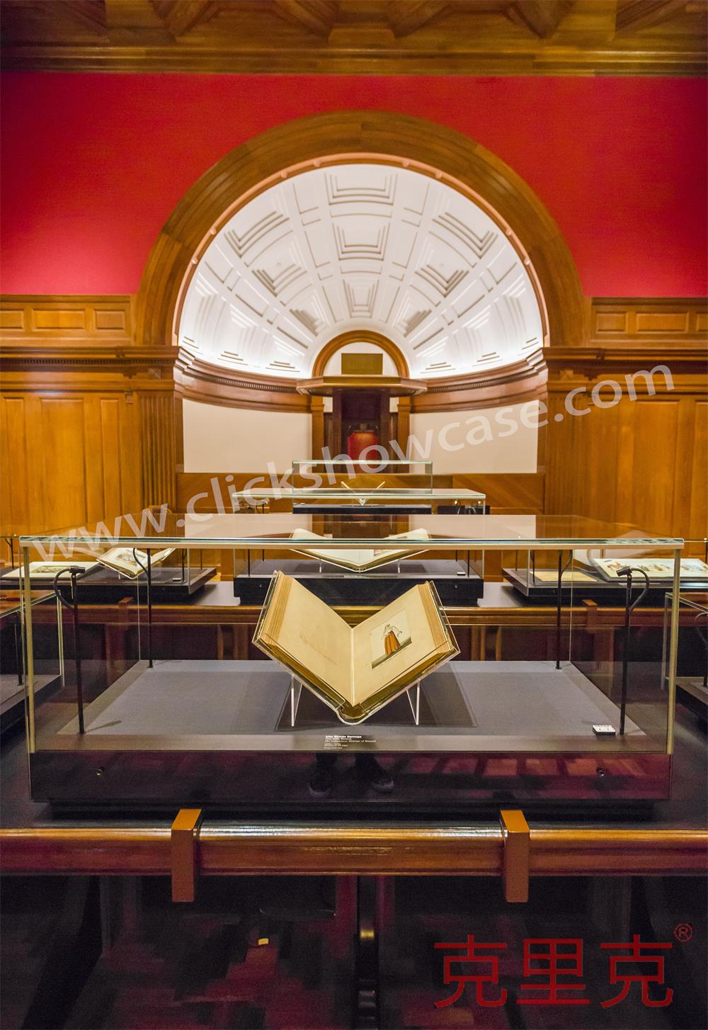 一件由四個獨立柜組成,長達近 5 米的特制展柜,使用了近 2.5 噸金屬,該組合展柜所有功能設備,包括光纖照明系統、半自動緩閉裝置、被動吸入式通風設施、電動開啟開關甚至一塊桌面觸控顯示屏幕都被巧妙的隱身在這個多層組合柜中。設計團隊甚至必須為用來放置展柜的桌子(具有歷史意義的桌子,同樣也是館藏文物)設計無接觸式的光纖照明系統。